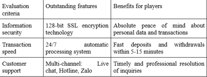 To compete in today's fierce betting market, the brand has constantly improved and upgraded its system comprehensively. These advantages do not just lie on the surface but penetrate deep into the daily user experience through support services. Below is a summary table of the outstanding values that players will receive when participating in the experience here:
