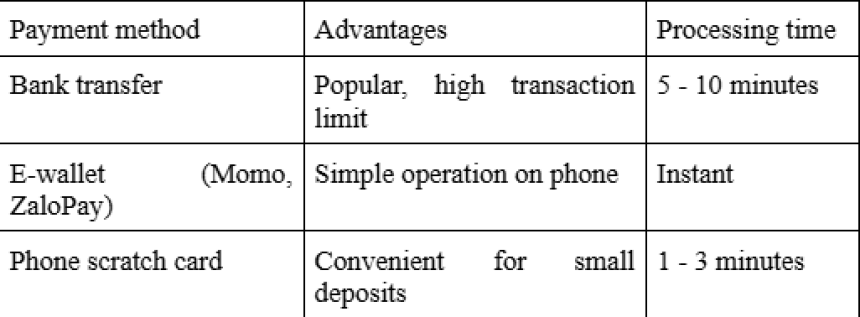 The flexible payment system is one of the greatest prides of this platform when serving users in the Vietnamese market. Close links with major banks and popular e-wallets have created an extremely convenient transaction network. Players can choose the most suitable method for their actual conditions to perform money transfer orders.